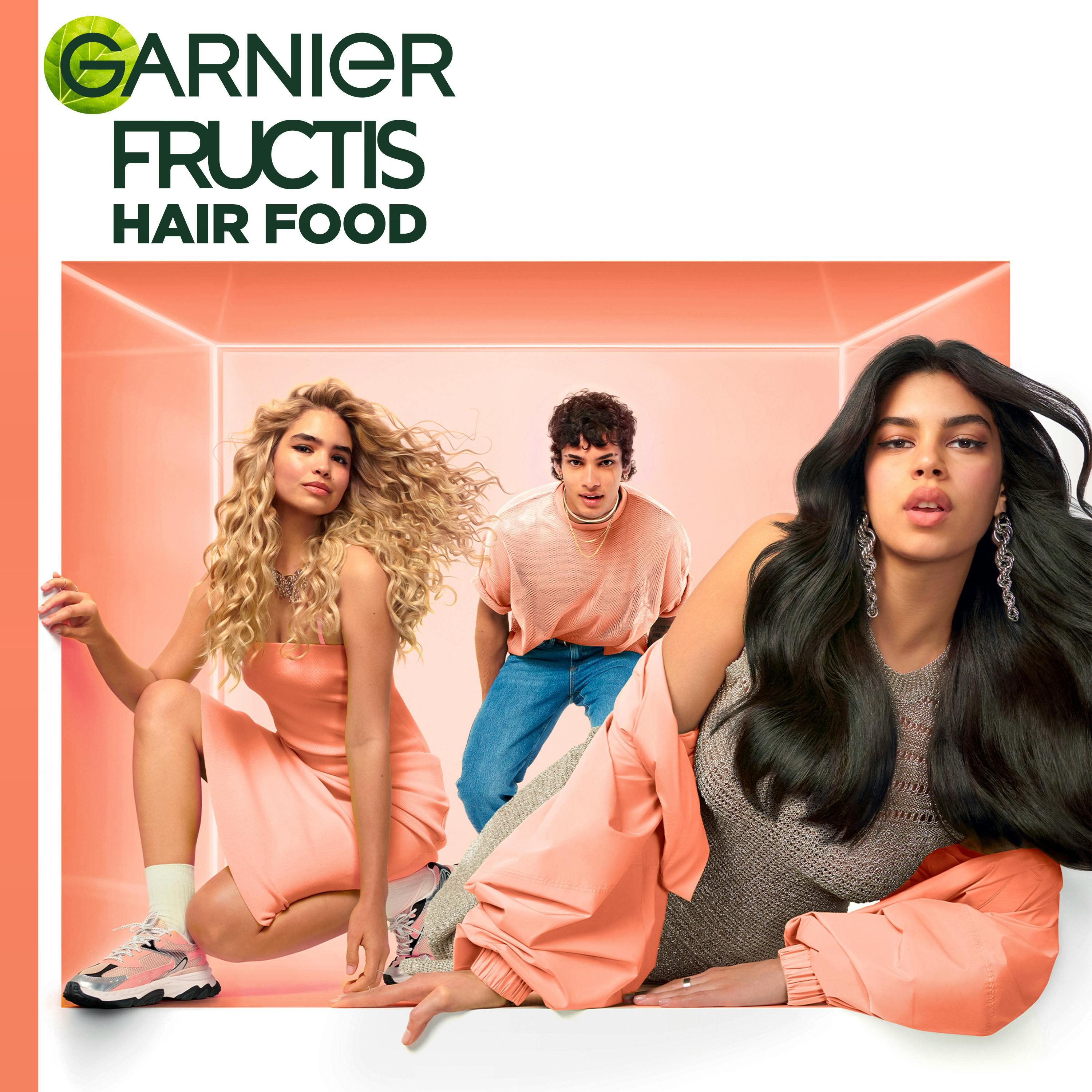 "Garnier Fructis Hair Food Pineapple hoitoaine pitkille, elottomille hiuksille. Koostumus antaa intensiivistä kiiltoa pituuksille, täyttää hiuksia kosteudella ja vahvistaa hiuksia. Vegaaninen koostumus* ei sisällä silikonia luonnollisen tunteen aikaansaamiseksi ja se sisältää omega 3,6, ja 9.