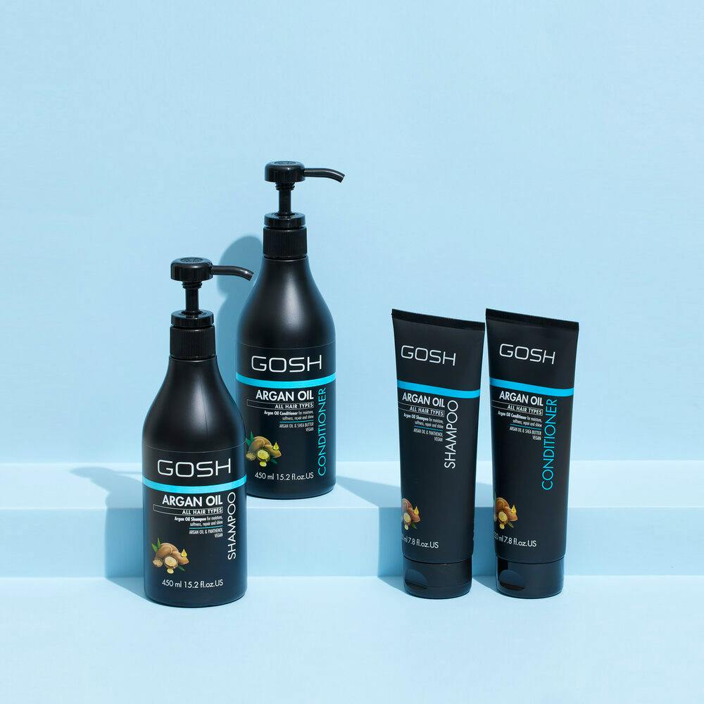 GOSH Argan Oil Conditioner on pehmentävä hiustenhoitoaine, joka sisältää luonnollista arganöljyä ja sheavoita. Tämä ylellinen koostumus kosteuttaa, vahvistaa ja pehmentää hiuksia välittömästi, jättäen ne poikkeuksellisen tuoksuviksi ja kiiltäviksi.