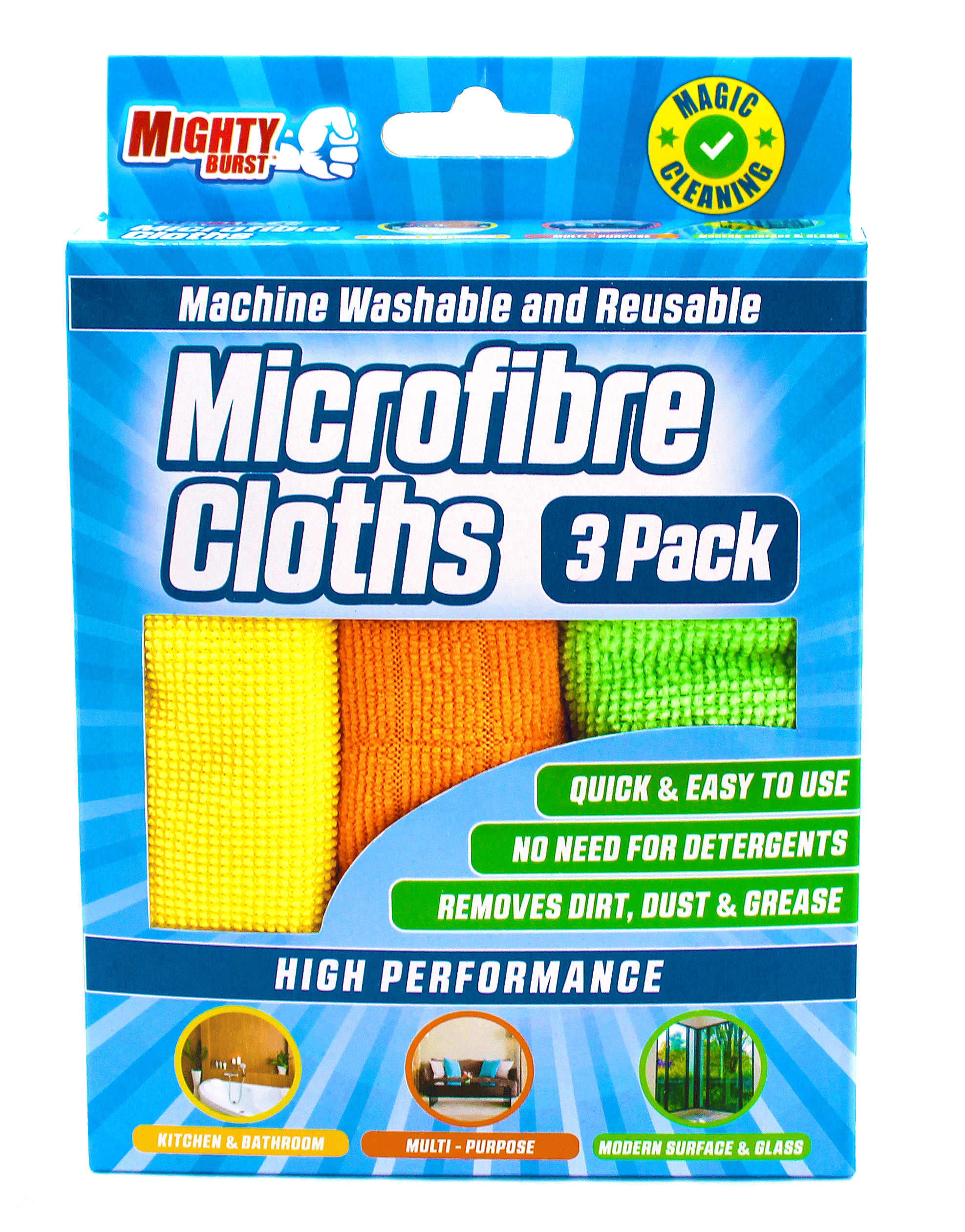Might Burst Microfibre puhdistusliinat sopivat keittiöön, kylpyhuoneeseen, sohvalle ja jopa lasille. Ne nopeuttavat ja helpottavat siivousta. Puhdistusliinat imevät likaa, joten et tarvitse poistoainetta. Liinat voidaan pestä koneessa ja käyttää uudelleen. Ympäristöystävällinen, helppo ja tehokas siivous on nyt mahdollinen! Koko: 3 kpl.