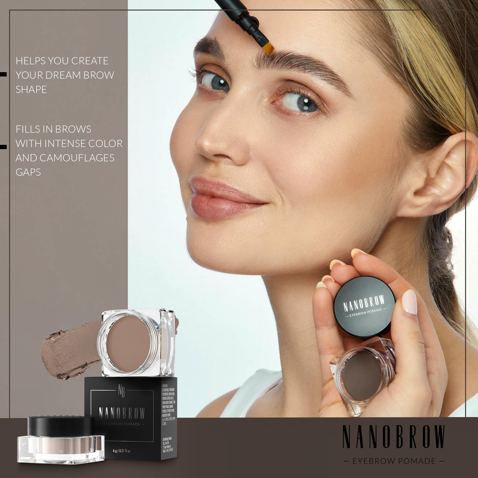Nanobrow Eyebrow Pomade Medium Brown on monipuolinen kulmakarvojen muotoilutuote, joka auttaa sinua saavuttamaan täydellisesti määritellyt kulmat vaivattomasti. Tämä pomade tarjoaa pehmeän ja kermaisen koostumuksen, joka levittyy helposti iholle, mahdollistaen tarkan levityksen ja pitkäkestoisen lopputuloksen. Keskiruskea sävy sopii erinomaisesti niille, jotka haluavat luonnollisen mutta huolitellun ilmeen, ja se täydentää monenlaisia hiusvärejä ja ihonsävyjä.