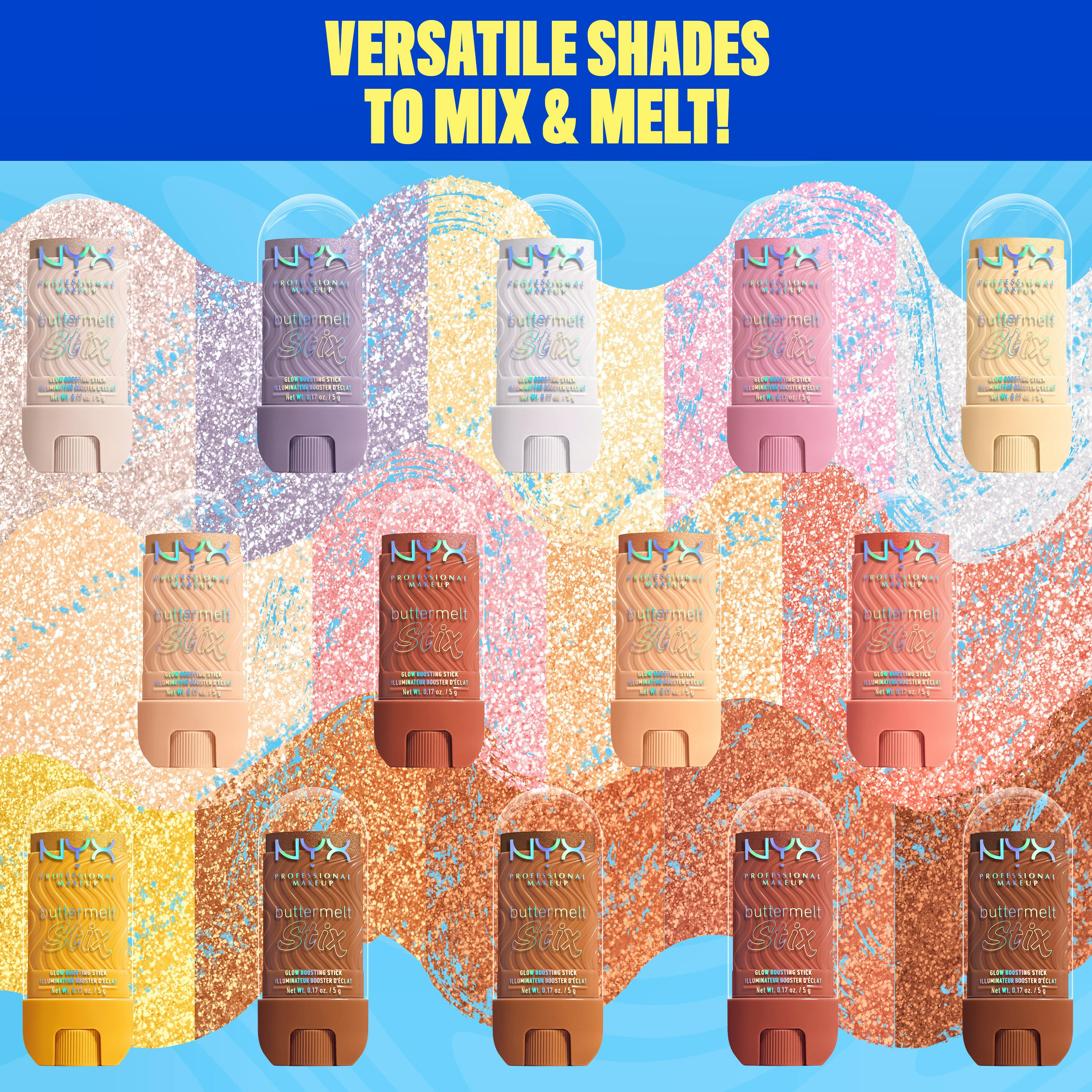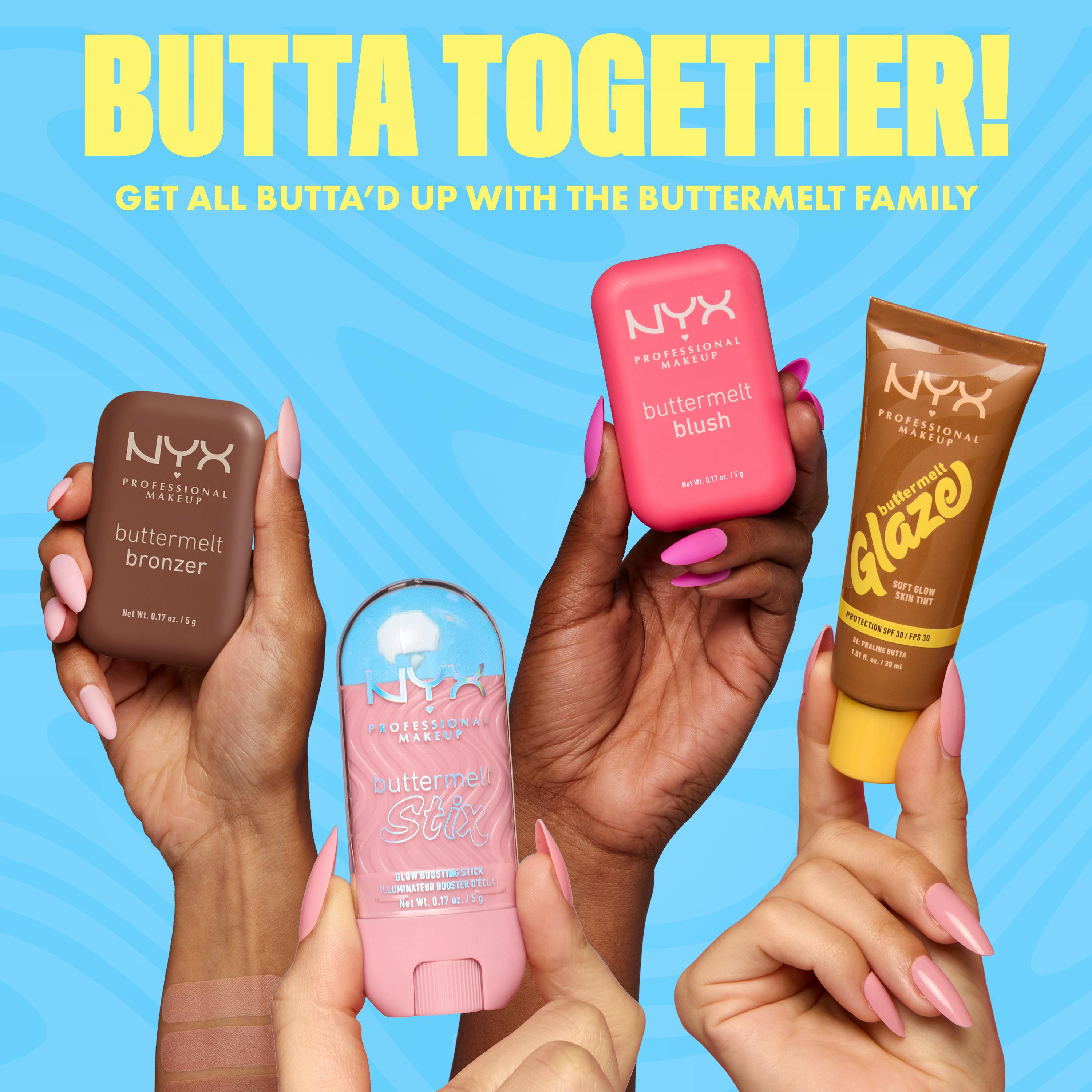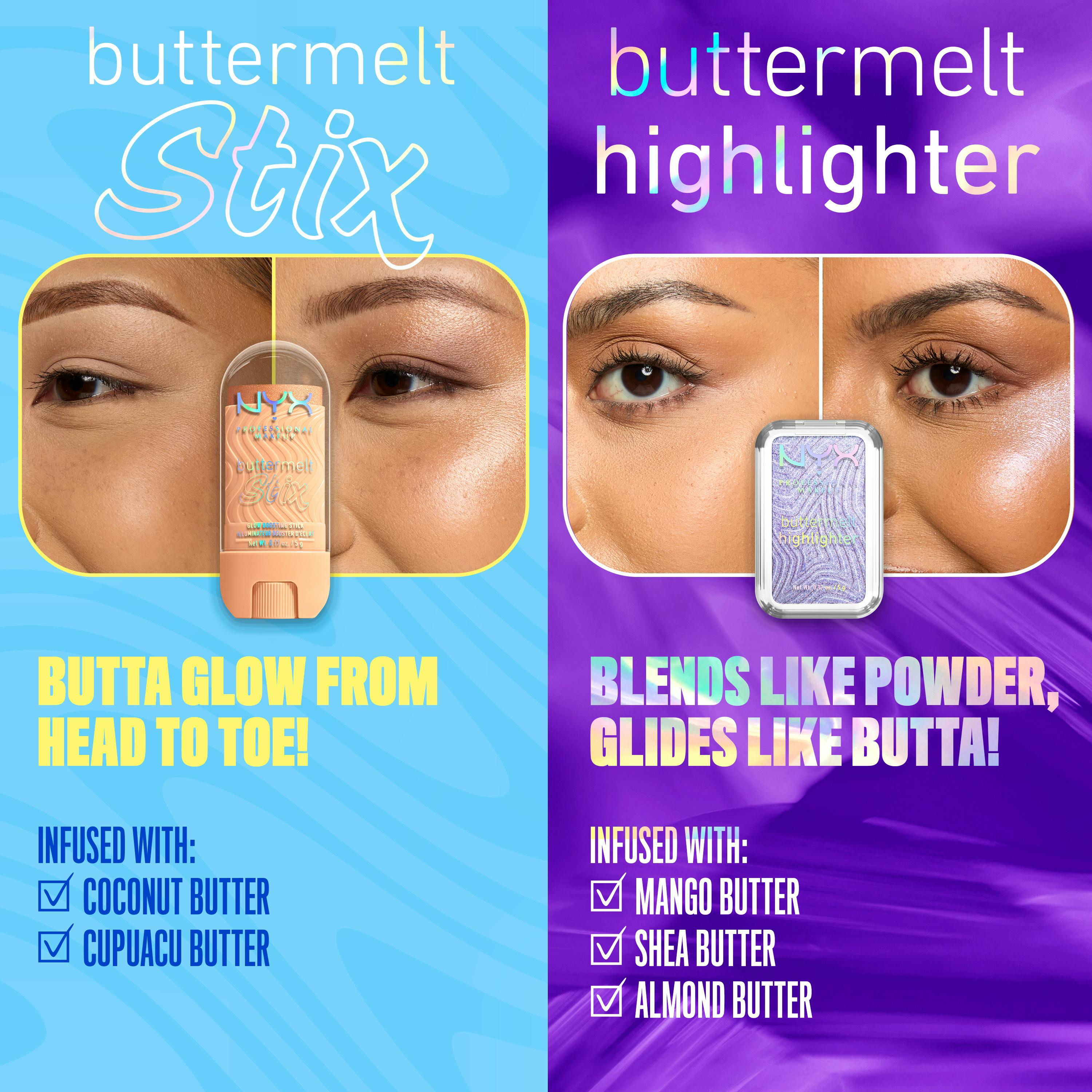 Pehmeää kuin VOI! NYX Professional Makeup Buttermelt Glow Boosting Highlighter Stix -korostuspuikot antavat iholle voinpehmeää korostusta ja hohtoa päästä varpaisiin.
