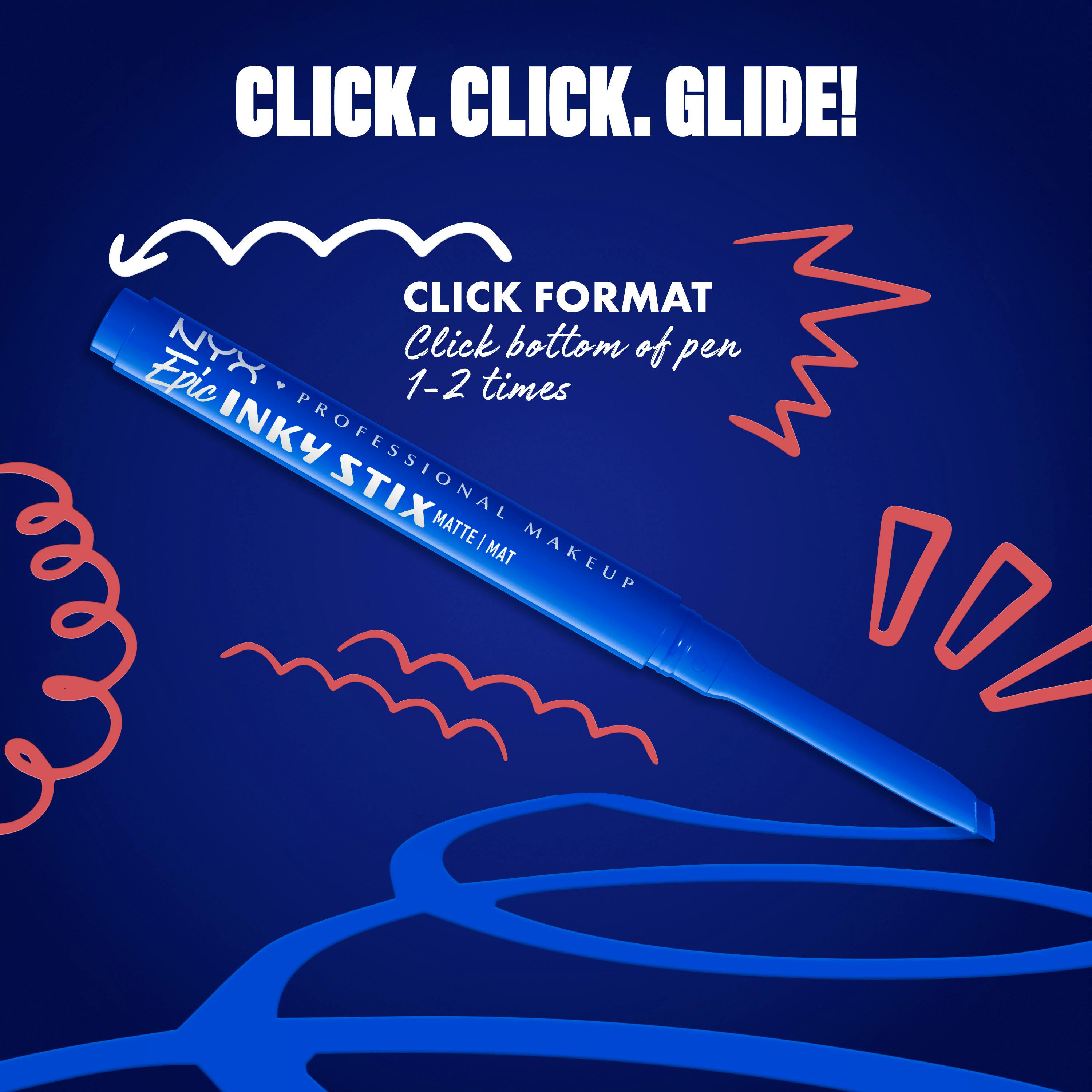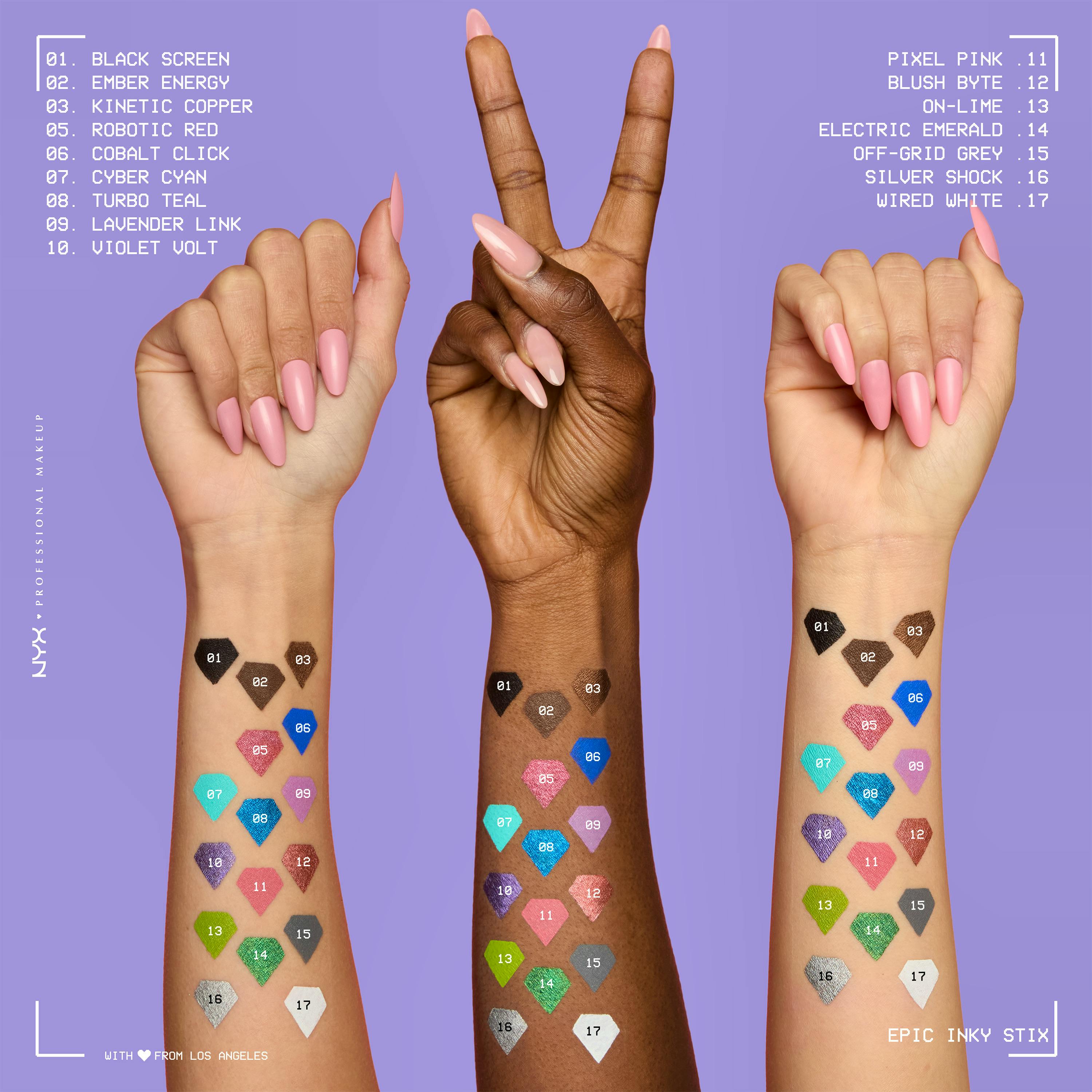 NYX Professional Makeup Epic Inky Stix vedenkestävä voidemainen geelirajauskynä upeisiin silmänrajauksiin. Voidemainen runsaspigmenttinen rajauskynä antaa koko päivän kestävän intensiivisen rajauksen vain yhdellä vedolla. Tarkka, viisto kärki mahdollistaa sekä paksujen että ohuiden rajausten vaivattoman piirtämisen, joten voit luoda monenlaisia rajauksia siipirajauksista näyttäviin graafisiin toteutuksiin ilman ylimääräisiä meikkisiveltimiä. Nopeasti kuivuva koostumus antaa intensiivistä väriä, joka ei leviä tai varise, joten lookisi pysyy virheettömänä koko päivän ja yön. Seuraa ihoa täydellisesti venyttämättä sitä - vain paljon INKY kynän väriä!