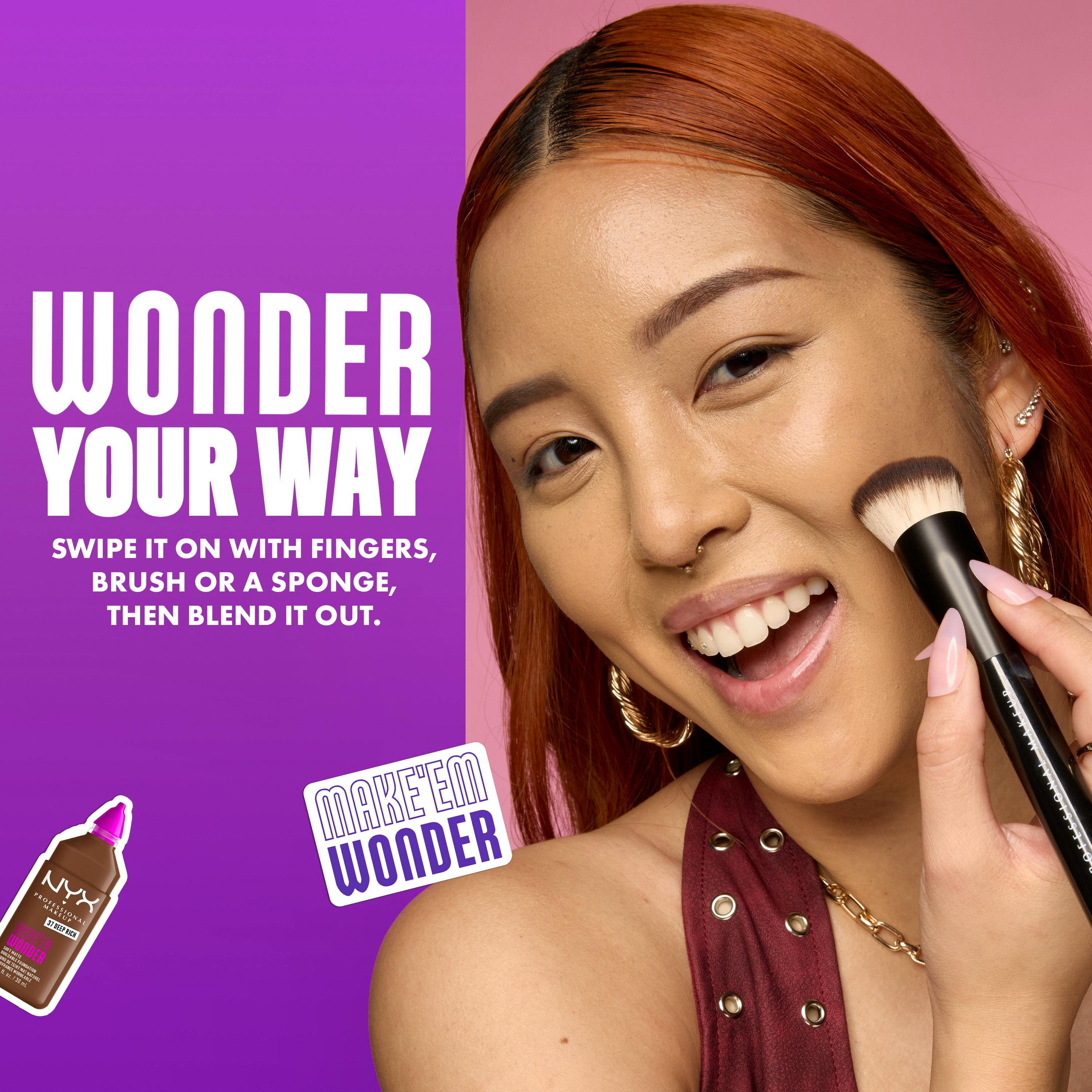 MAKE 'EM WONDER -meikkivoide antaa pehmeän mattapintaisen ja kerrostettavan ihoa muistuttavan lopputuloksen. NYX Professional Makeup Make'em Wonder ihoa hoitavia ainesosia sisältävän meikkivoiteen koostumus antaa täyden peittävyyden, mutta tuntuu silti keveältä iholla ja kestää koko päivän. Kuin oma ihosi, mutta sileämpi, ​​tasaisempi ja heleämpi. Koostumus sisältää guaranauutetta, joka tunnetaan heleyttävistä ominaisuuksistaan, sekä hyaluronihappoa, joka kosteuttaa ihoa välittömästi eikä jätä kakkumaista tunnetta. Kerrostettavan koostumuksen avulla voit luoda haluamasi lookin ’no-makeup’ -meikistä ylelliseen glamouriin. Haalistumaton ja tahraamaton sekä veden- ja hienkestävä meikkivoide saa ihon näyttämään heleältä koko päivän.