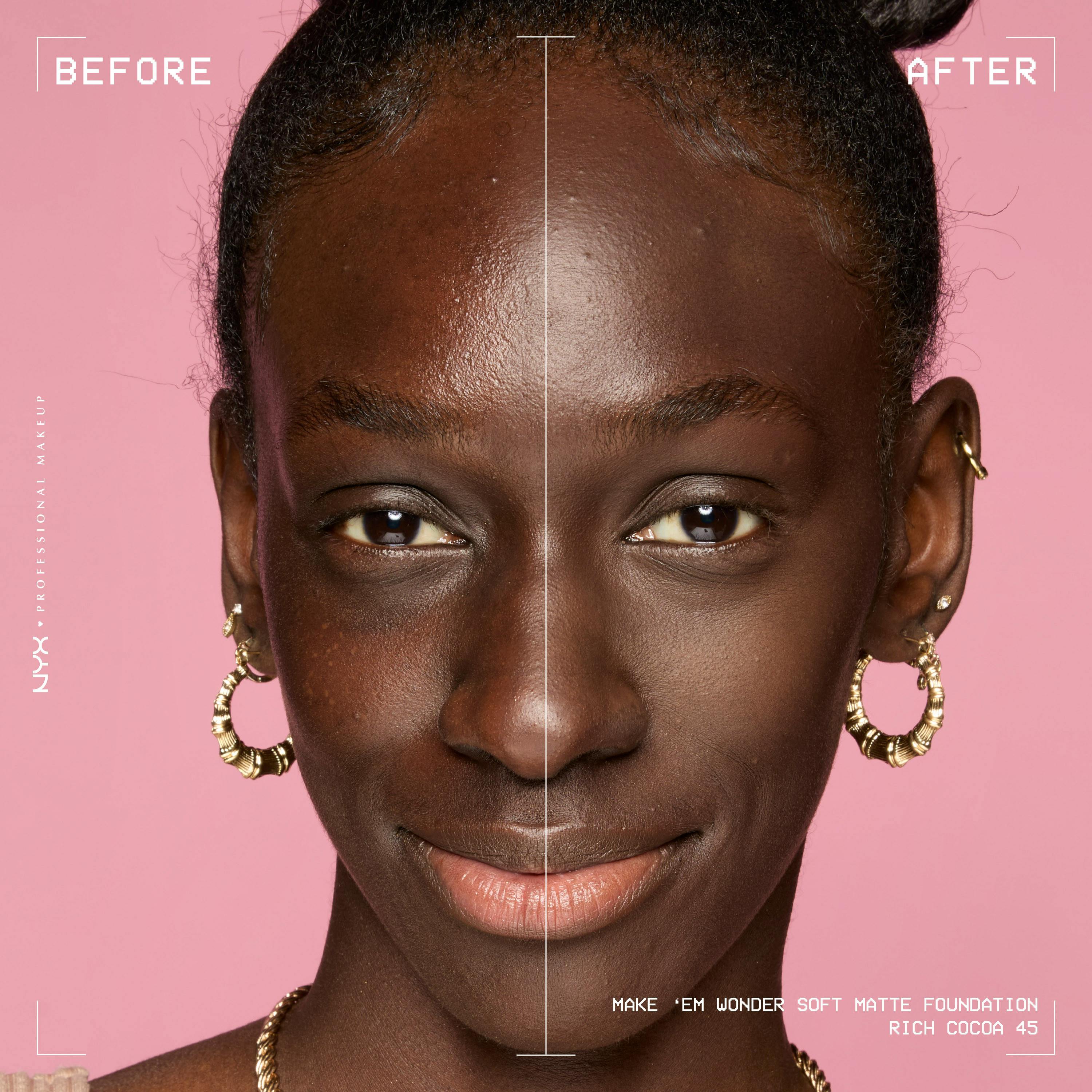MAKE 'EM WONDER -meikkivoide antaa pehmeän mattapintaisen ja kerrostettavan ihoa muistuttavan lopputuloksen. NYX Professional Makeup Make'em Wonder ihoa hoitavia ainesosia sisältävän meikkivoiteen koostumus antaa täyden peittävyyden, mutta tuntuu silti keveältä iholla ja kestää koko päivän. Kuin oma ihosi, mutta sileämpi, ​​tasaisempi ja heleämpi. Koostumus sisältää guaranauutetta, joka tunnetaan heleyttävistä ominaisuuksistaan, sekä hyaluronihappoa, joka kosteuttaa ihoa välittömästi eikä jätä kakkumaista tunnetta. Kerrostettavan koostumuksen avulla voit luoda haluamasi lookin ’no-makeup’ -meikistä ylelliseen glamouriin. Haalistumaton ja tahraamaton sekä veden- ja hienkestävä meikkivoide saa ihon näyttämään heleältä koko päivän.