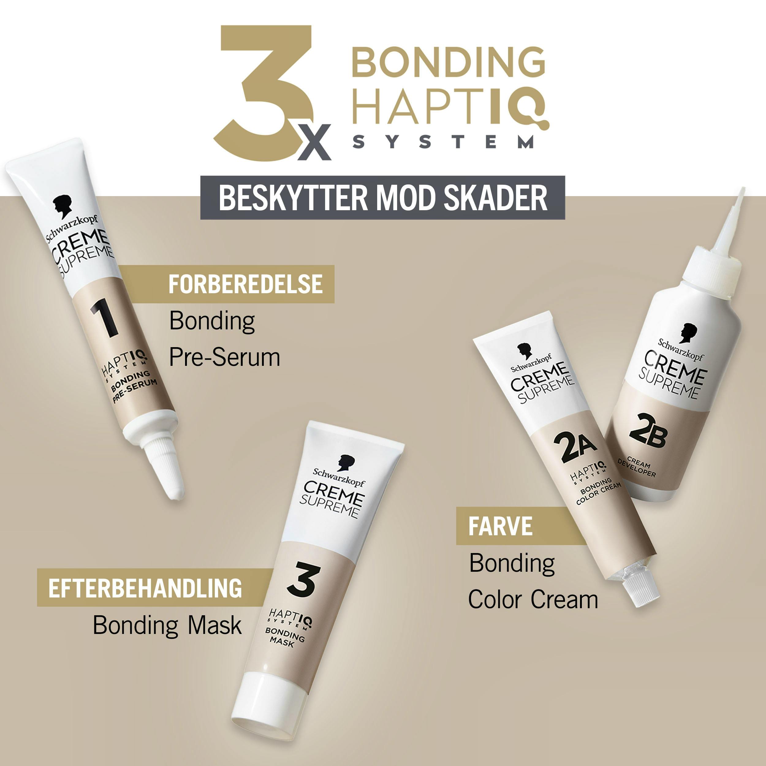 Schwarzkopf Creme Supreme 9-0 Natural Light Blonde on pysyvä hiusväri, joka yhdistää haluamasi eloisan sävyn ja hiustesi tarvitseman hoidon. Tämä ravitseva hiusväri hyödyntää edistynyttä 3x Bonding HaptIQ -järjestelmää, joka valmistaa, suojaa ja vahvistaa hiuksiasi tarjoten upean ja tasaisen värin. Järjestelmään kuuluu bonding-esiseerumi, joka silottaa ja vahvistaa hiuksia luomalla uusia mikrosidoksia, varmistaen vahvan pohjan värjäysprosessille. Bonding-värikomponentti suojaa hiuksia vaurioilta värjäyksen aikana, ja bonding-hoitoaine muodostaa hiusten ympärille suojaavan kerroksen, lisäten niiden kestävyyttä ja kiiltoa.