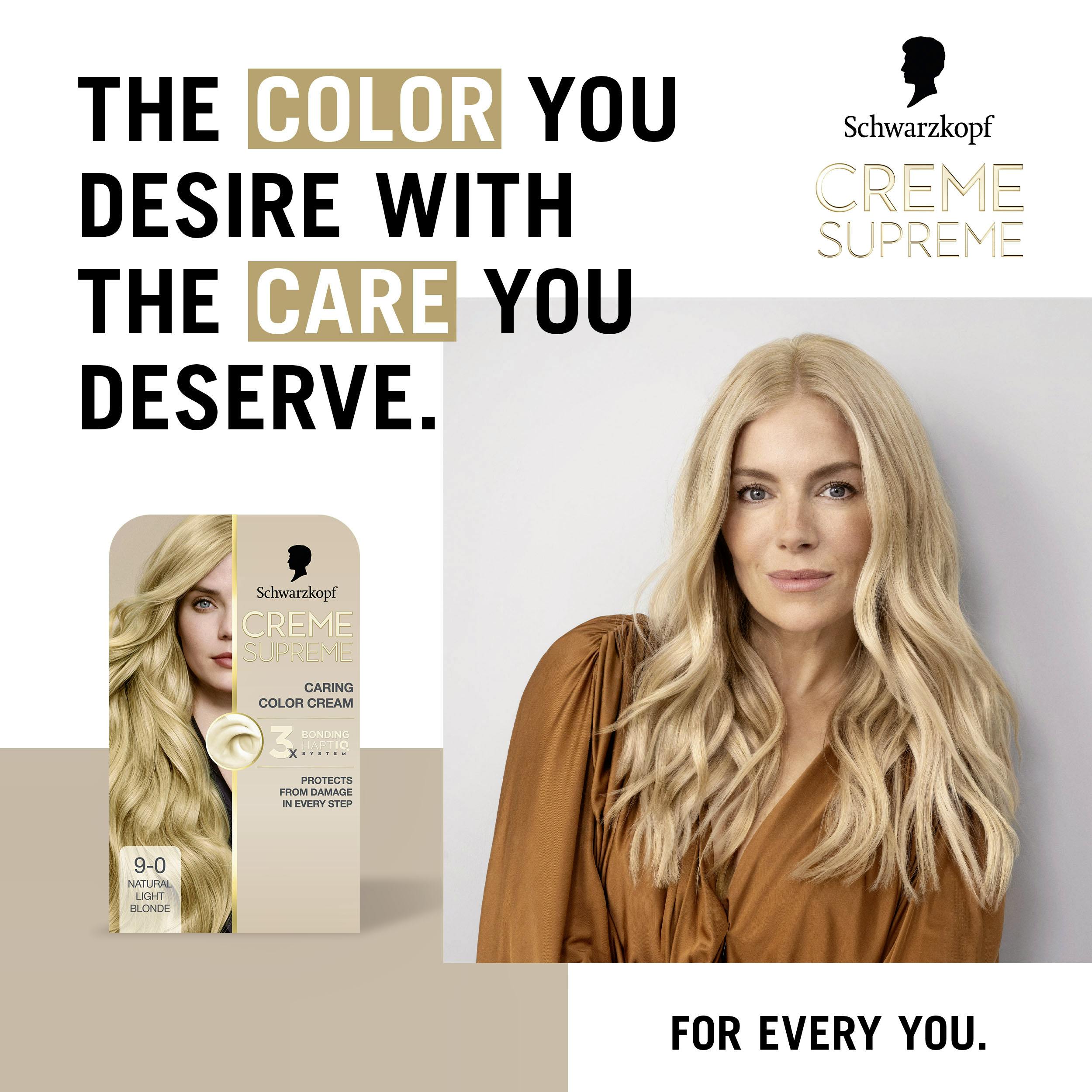Schwarzkopf Creme Supreme 9-0 Natural Light Blonde on pysyvä hiusväri, joka yhdistää haluamasi eloisan sävyn ja hiustesi tarvitseman hoidon.